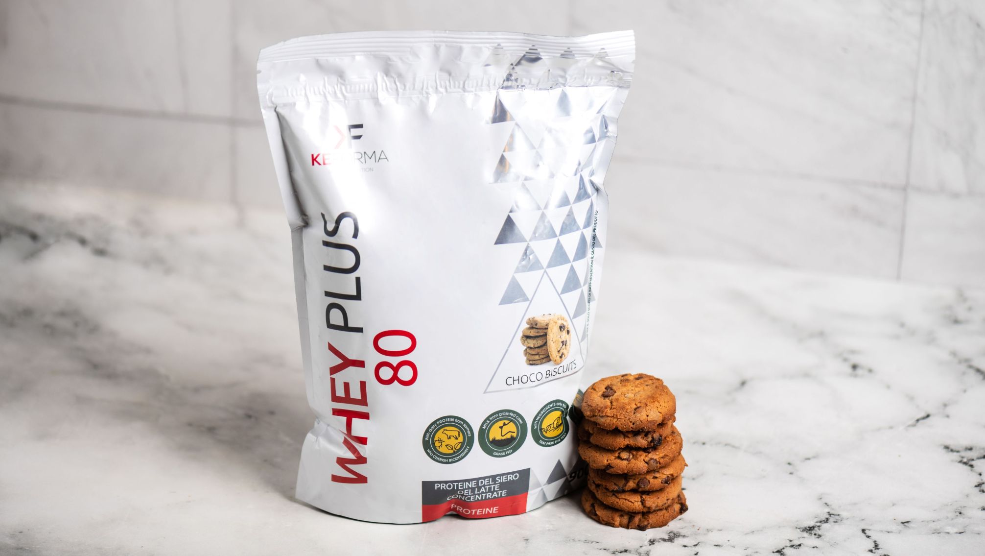 Сары су ақуызының концентраты (құрамында лактоза бар), сүт ақуызының концентраты (құрамында лактоза бар), қара шоколад кесектері 5% (үгілген какао, қант, какао-май, сусыз май, майғындағыш: соя лецитині, ваниль табиғи хош иістендіргіші), мальтодекстрин, хош иістендіргіштер, қоюландырғыш: карбоксиметилцеллюлоза натрий тұзы, кесектелуге қарсы агент: кремний диоксиді, тәттілендіргіштер: сукралоза, калий ацесульфамы.